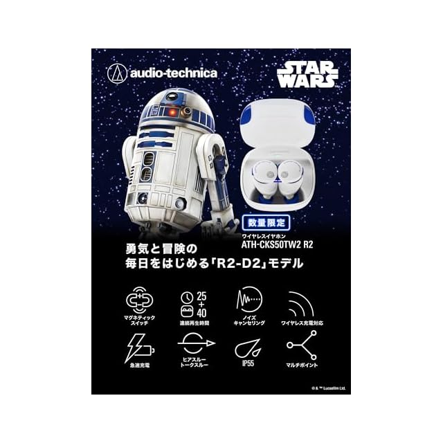 オーディオテクニカ ATH-CKS50TW2 R2 R2-D2 スター・ウォーズ ワイヤレスイヤホン Bluetooth 5.3 ノイズキャンセリング 重低音 ルーカスフィルムスタジオ公認デザイン 限定音声ガイダンス マグネティックスイッチ 約65時間再生 LE Audio 防水防塵 マルチポイント Qiワイヤレス充電 | つむぎ屋