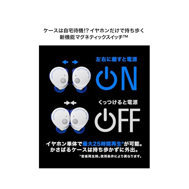 ケースは自宅待機、イヤホンだけで使える「マグネティックスイッチ 」機 能:イヤホンを取り出して左右に離すと電源ON 、マグネットでくっつけると電源OFFできる機能を搭載しました。これまでの完全ワイヤレスイヤホンで感じる「充電ケースに入れないと電池切れ が心配」「毎回ケースから取り出すのが面倒」といったストレスから解放され、使いたいときにすぐ使えます。