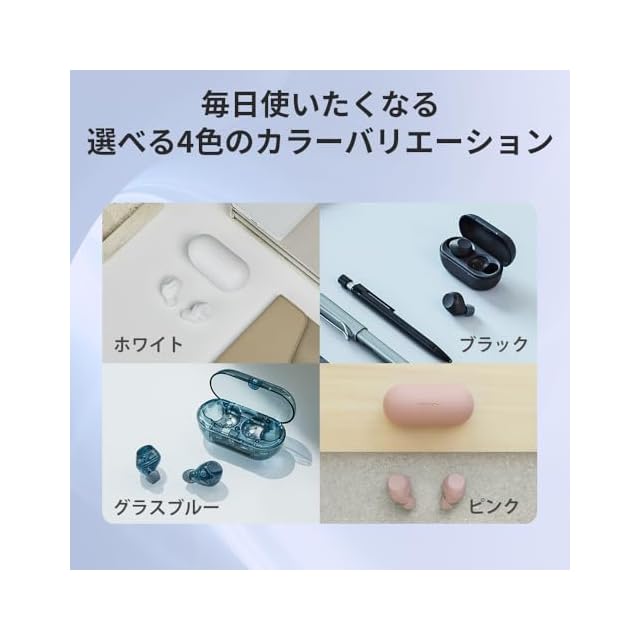 本体及びケースをコンパクトに設計。耳からの出っ張りを抑えることで装着感を高め、スマートな装着姿を実現します。長時間のリスニングでも疲れにくい快適な装着性を実現しています。さらにトレンドのくすみカラーを採用した、ラベンダー、セージグリーンとベーシックなホワイト・ブラックからファッションに合わせてお選びいただけます。