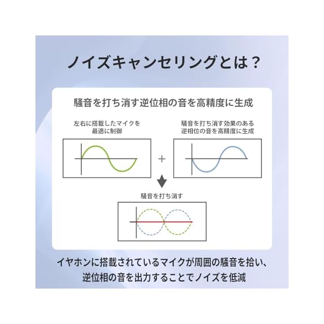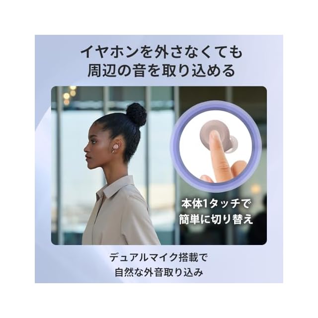 左右に搭載したマイクを最適に制御し、騒音を打ち消す効果のある逆位相の音を高精度に生成。高いノイズキャンセリングで、電車やバスなどの騒音環境下、また街中やカフェなどの人の声が多い環境でも、音楽だけに没入できます。さらに、自然な外音取り込みも搭載しています