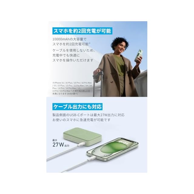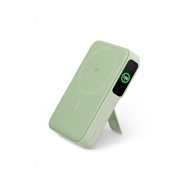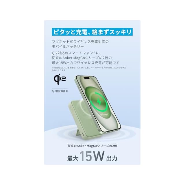 Anker MagGo Power Bank (10000mAh) モバイルバッテリー Qi2認証 ワイヤレス充電 最大出力15W MagSafe対応 マグネット式ワイヤレス充電対応 コンパクト 折りたたみ式スタンド iPhone 16 / 15 / 14 / 13 シリーズ専用 (グリーン) | つむぎ屋