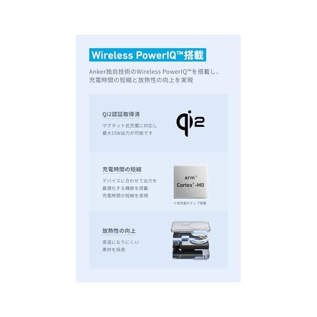Wireless PowerI搭載:Anker独自のWireless PowerIを搭載し、充電時間の短縮と放熱性の向上を実現。