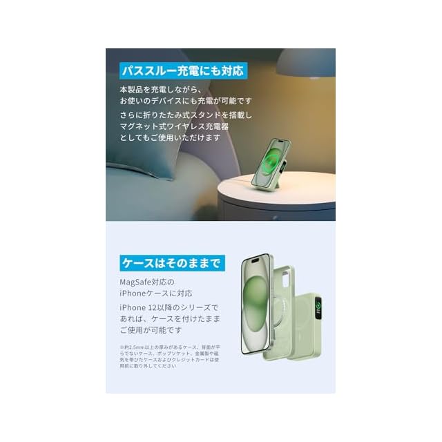 パススルー充電にも対応:本製品を充電しながら、お使いのデバイスにも充電が可能です。さらに折りたたみ式スタンドを搭載し、マグネット式ワイヤレス充電器としてもご使用いただけます。