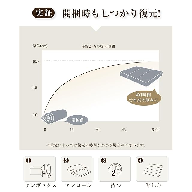 【ご注意&一年間安心】この折りたたみマットレスはセミダブルです、真空圧縮された状態で出荷されます。到着後、風通しの良い場所で開封し、無害な臭いを放ちながら最高の膨張効果を得るために24~72時間お待ちください。展開のサイズは195長さx120幅x10厚みcmです。本製品はご購入日より、一年間(※商品本体に起因する故障に限ります)安心がございます。当店ではお客様に安心してご利用いただけるよう、サポート体制を整えておりますので、製品に何かございましたら、いつでもお気軽にお問い合わせください。
