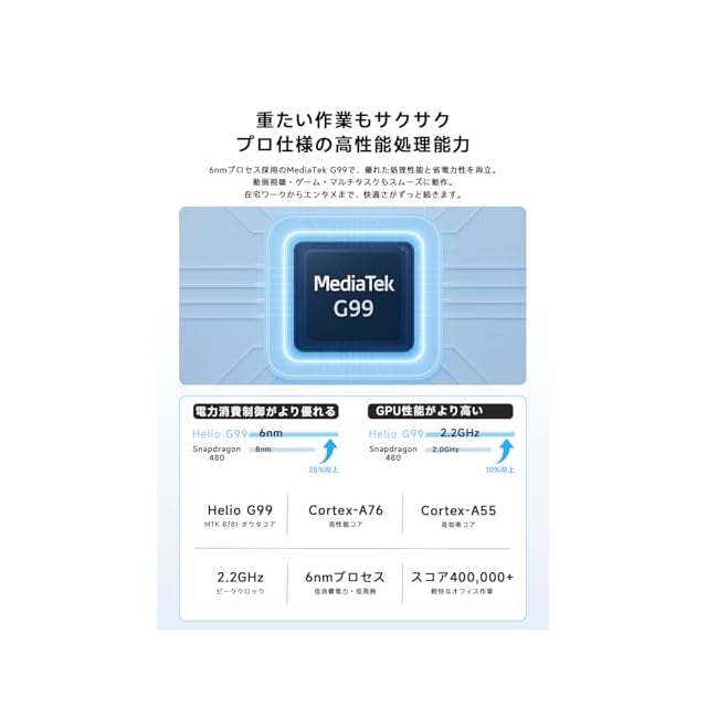 ✅【CPU性能も進化】 MediaTek G99は最大2.2GHzの高クロックに対応。Snapdragon 480(2.0GHz)と比べて約10%性能アップ、日常の操作やアプリ起動もよりスムーズです。 【マルチタスク処理対応】複数アプリを同時に使用しても快適のAndroid タブレットです。 【高速5G通信対応】外出先でもスピーディな接続 在宅ワーク、オンライン学習、エンタメなど幅広いシーンで活躍、コストパフォーマンスに優れた選択肢としても最適。 【Android 15搭載・AIスマート】 最新のタブレットOSで、スムーズな操作性と強化されたセキュリティを実現。 より厳格な権限管理とデータ暗号化により、ユーザーのデータ安全性とプライバシーを強力に保護。 最新のAndroid 15を搭載し、AIスマート機能にも対応したアンドロイド タブレット 。ノートパソコンはもう必要なし。PHILIPS T8015タブレットは、PC代わりとしての生産性と、軽量・持ち運び便利なタブレットの特長を両立。 ビジネス用途にも、学習用タブレットとしても最適。仕事も学びも、これ一台で完結。スマートかつ効率的に。