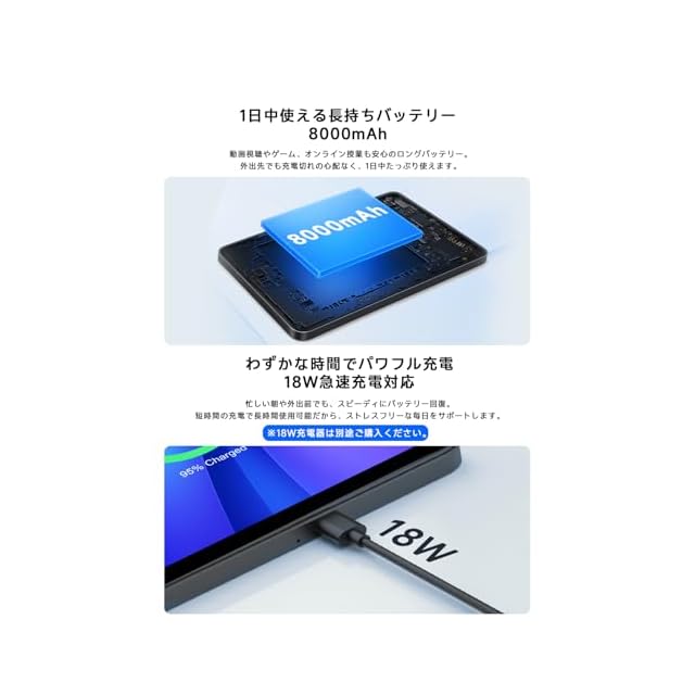 ✅【8000mAh+18W急速充電】 【8000mAhの超大容量バッテリー搭載タブレット&長時間駆動で安心】動画視聴、ゲーム、オンライン授業まで、あらゆるシーンで安定した長時間の使用が可能。一日中、快適に使えてバッテリー切れの心配なし。外出時でもモバイルタブレットとして安心して使える、バッテリー長持ちのAndroidタブレットです。 【18W急速充電テクノロジー搭載】高性能タブレットにふさわしい、スピーディーな充電機能を実現。忙しい朝や出先でも短時間で効率的に充電でき、バッテリー不安を解消します。※18W充電アダプターは別売りです。 注意事項: Android 15システムには、充電時のアニメーション効果とサウンド通知が標準搭載されています。 充電開始時のエフェクト: 画面の片側から反対側へ波のようなアニメーションが流れ、充電の開始を視覚的に知らせます。 サウンド通知について: 音量は小さめに設定されており、不要な場合は設定からオフにできます。