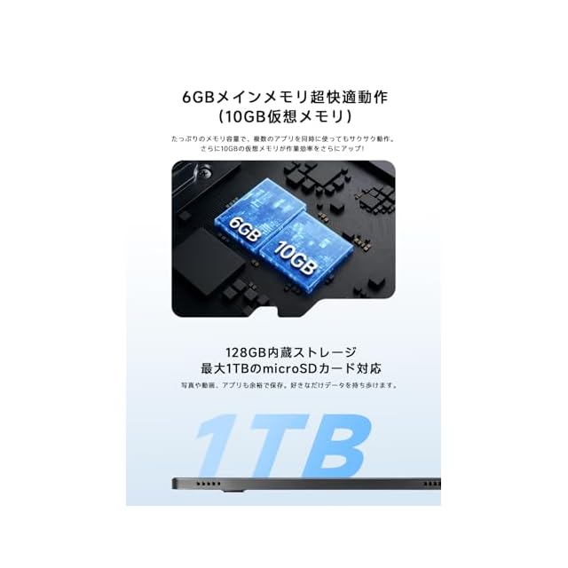 ✅【高画質デュアルカメラで、さまざまな撮影シーンに対応】 フロントカメラ:500万画素(固定フォーカス) リアカメラ:1300万画素(オートフォーカス / F2.0) オンライン会議、ビデオ通話や写真撮影も鮮明な画質でしっかり対応。日常の記録も手軽に。 ✅【 6GB+10GBメモリ/128GBストレージ+1TB拡張】 【6GB実行メモリ + 最大10GBの仮想メモリ拡張】アプリの切り替えもスムーズで、動作のもたつきなし。動画視聴やWeb閲覧、オンライン学習まで、快適なマルチタスク環境を提供します。さらに、10GBの仮想メモリ拡張により、より大きなメモリ空間を確保。 日常使いはもちろん、負荷の高い作業もストレスなくこなせるアンドロイド タブレットです。 【128GBの大容量ストレージを内蔵、たっぷり保存できる安心感】さらに、最大1TBのmicroSDカード拡張にも対応。動画、写真、アプリ、学習データなど、大切なコンテンツを余裕で保存できるタブレットです。