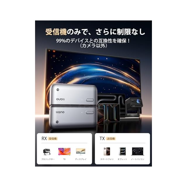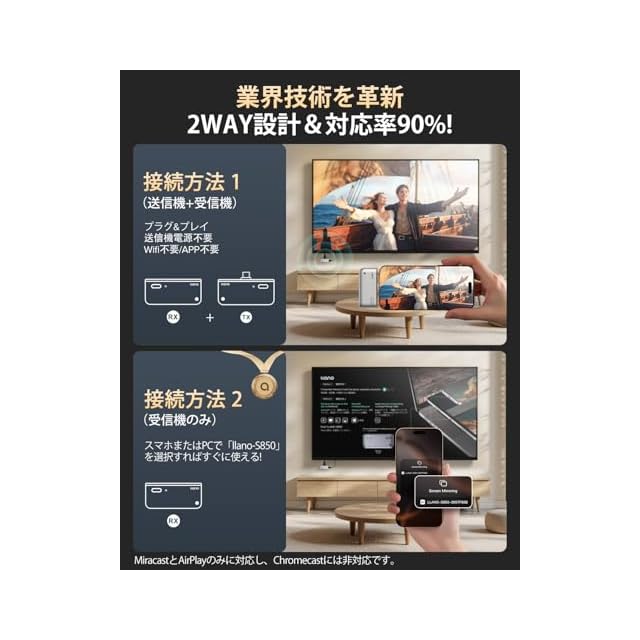【⚡業界初の革新!2つのモードで90%のデバイスに対応】従来の送受信機モードに加え、llanoのhdmi 無線製品は受信機のみで簡単にミラーリングができる新機能を搭載。よりシンプルで使いやすくなりました。受信機モード:送信機なしで、受信機(RX)を接続するだけで、簡単にミラーリングが可能。操作が簡単で、誰でもすぐに使えます。送受信機モード:送信機(TX)と受信機(RX)を接続するだけで、デバイスが自動で接続され、手動設定なしでスムーズに使用できます。注意 万が一接続できなければ、90日間無条件で返品・交換いたします!
