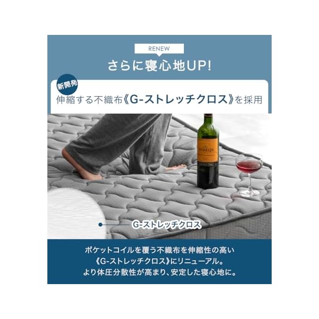 ■新開発!伸縮する不織布"G-ストレッチクロス"を採用!ポケットコイルの耐圧分散性が高まり、安定した寝心地に。また、振動が伝わりにくいため、二人以上でも快適にご使用いただけます。