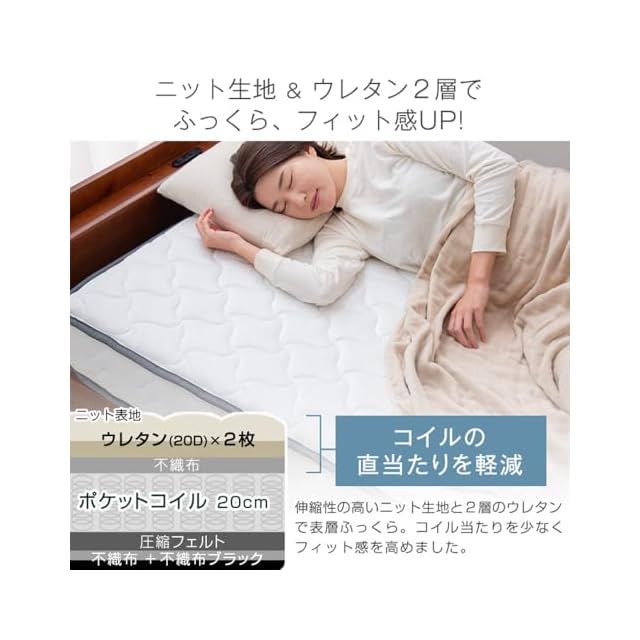 【素材】【表地】ニット生地(ポリエステル100%)【裏面】不織布【内部】ポケットコイルスプリング、不織布・ウレタンフォーム・フェルト