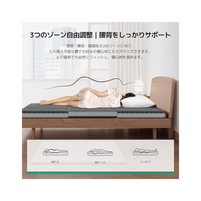 【2層構造マットレス|3エリア自由調整|腰背をしっかりサポート】 Noviilla マットレスは、4cmの高反発ウレタンフォーム(140N)と6cmの高反発ウレタンフォーム(200N)を組み合わせた2層構造で、理想的な寝心地を提供します。クッション層:140N 高密度低反発ウェーブフォーム、ウェーブ状の構造で体圧を分散し、体の一部にかかる圧力をやわらげます。通気孔構造でムレにくく、長時間使用しても快適な寝心地を維持します。サポート層:200N 高密度高反発ウレタンフォーム、しっかりとした反発力で背骨を支え、「安定したサポート基準」を作り、自然な寝姿勢を守ります。硬さがしっかりしてへたりにくく、長期間でも安定したサポート力と耐久性を保ちます。三つ折り ベッドマット 低反発層の柔らかさと高反発層の硬さ、内部構造を裏返して使用することで、耐久性が最大6倍に延びます。お好みに合わせて硬さや寝心地を調整いただけます。頭部・腰部・脚部の3つのエリアは、層を入れ替えることで理想の寝心地にカスタマイズ可能です。季節や体調、寝姿勢に合わせて最適な硬さを選ぶことができ、疲れにくい快適な眠りを実現します。