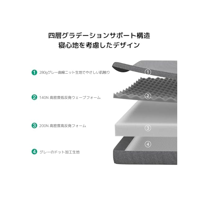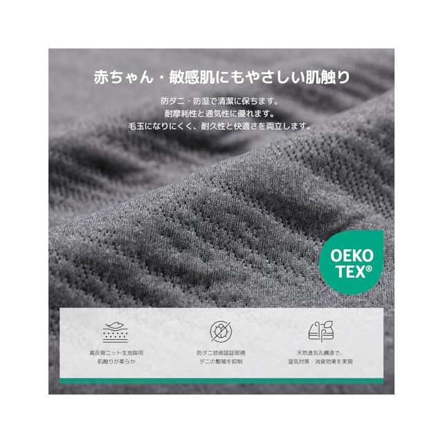 【柔らかく&通気性のある生地|滑り止め底面設計】 Novilla 折りたたみマットレスの表面層 280g グレー曲線ニット生地には、肌にやさしくソフトで、防ダニ・抗アレルギーの機能を併せ持つファブリックを使用しています、柔らかく滑らかな質感で肌に心地よくフィットします。国際的に認められた OEKO-TEX 認証を取得し、有害物質を含まないことが確認された品質で、ご家族皆様にお使いいただけます。赤ちゃんや敏感肌の方にもやさしい肌触りの生地。底面層 グレーのドット加工生地、ベッドフレームに密着し、全体の安定性を高め、ズレにくくします、マットレスの上に重ね使いでも直置きでもズレにくく、安定性に優れています。