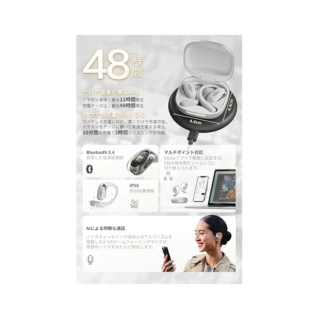 AIノイキャン通話・音漏れ防止機能:高度なノイズキャンセリング技術とAIアルゴリズムを搭載した4つのビームフォーミングマイクを揃えています。Shokz独自の「DirectPitch 2.0」技術という指向性技術は音漏れを防ぎながら耳への大音量をし、通話中もプライバシーを守り周囲への迷惑を軽減します。専用アプリのプライベートモードと併用すれば、音漏れ防止の効果がさらに高まり、日々の生活にも安心してご利用いただけます。
