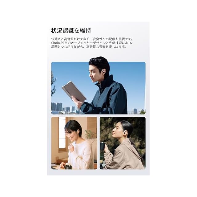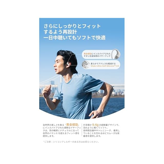オープンイヤー型ならではの快適さ:耳を塞がないオープンイヤーデザインと片耳9.4gという軽さにより、長時間の使用でも聞き疲れや蒸れを感じません。「Shokz Ultra-Soft Silicone 2.0」と一体型のニッケルチタン合金で作られた柔軟なイヤーフックは、さまざまな耳の輪郭にフィットし、日常使いから激しいワークアウトまで、落ちにくさをしっかり実現します。外と繋がっていて周囲の状況に注意を払い、安全安心で音楽を楽しめます。