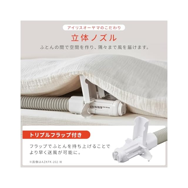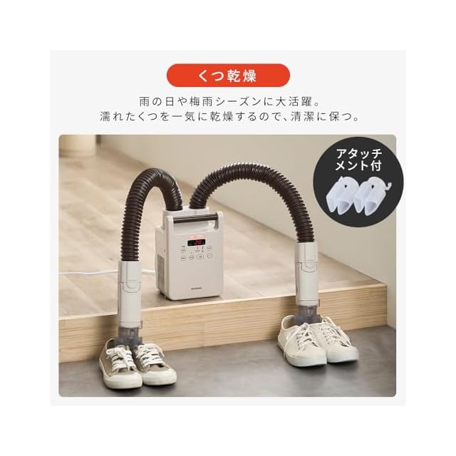 【左右サイドフラップ】立体ノズルにサイドフラップが付くことで安定感UP♪立体型フラップが布団の中で大きな空間を作り、隅々まで風を届けます。【保温モード】自動モード運転中に保温ボタンを押し、運転終了後最大2時間の間、あたためと停止を繰り返し、お休みに適した温度を保つことができます。※夏・ダニモードでは保温設定できません。【便利な靴乾燥】付属のアタッチメントを取り付けることで、2足を一気に乾燥できます。スニーカーやブーツ、革靴にも対応!※本革や合皮、ビニール製など耐熱温度の低い素材の場合、「送風モード」を使用ください。