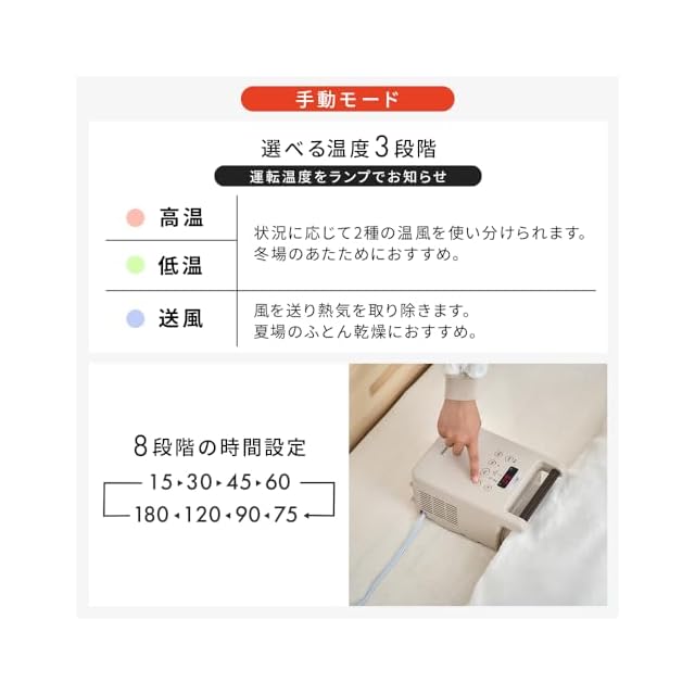 【自動乾燥モード4種】①あたためモード:冷えた布団を短時間であたため。寝る前の使用がおすすめです。②冬モード:あったか温風仕上げ。布団を温め、ふんわり仕上げます。③夏モード:さわやか送風仕上げ。温風でカラッと乾燥。さわやかな風で熱気を逃します。④ダニモード:約50℃以上の温風でダニ対策!天日干しができない時期でも布団を清潔に保つことができます。※ダニは50℃以上の高温で30分以上加熱すると死滅するといわれています。