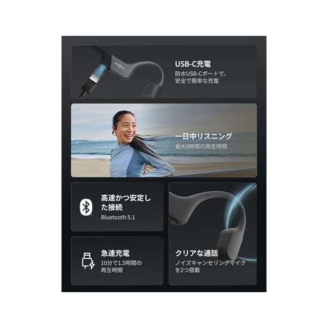 第8世代の骨伝導テクノロジー:PremiumPitch2.0+の骨伝導技術が、広がり豊かなステレオサウンドをお届けします。柔らかいシリコンコーティングとわずか26gの軽量デザインで、ストレスフリーな使用感を提供。耳を開けたまま、しっかりとしたフィット感を味わいながら、長時間のワークアウトも快適に行えます。周囲の状況に気を配りながら、ランニングを安全かつ心地よく楽しむことができます。