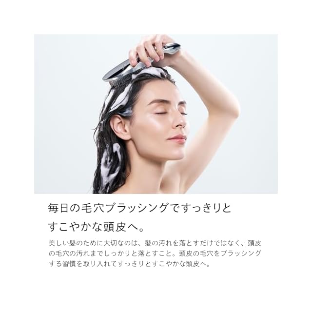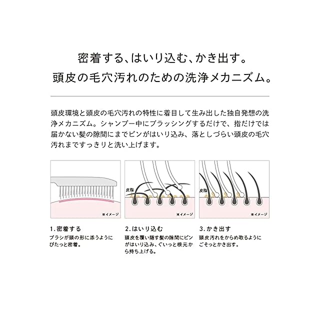 【頭皮までピンがはいり込む グラデーションタッチ毛】2つのかたさのピンが段階的に触れることで、届きにくい頭皮にまではいり込みます。