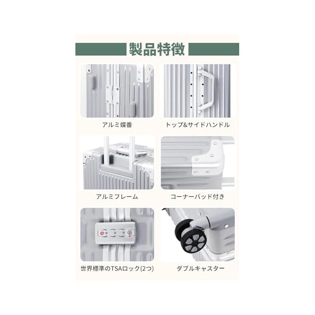 【軽量で、大容量】人気のアルミフレームを採用しており、ビジネスでもカジュアルでもシーンを選ばずに使用できます。本体は耐久性に優れたABS樹脂とPC製で、密閉度の高いアルミフレームにより、ファスナーレスとなっております。【注意】フレームの材質だけがアルミニウムです。スタイリッシュでありながら、5サイズの重量はわずか3~5KG、それでいて容量は35ℓ~90ℓと国内旅行や小旅行には十分な大きさです。