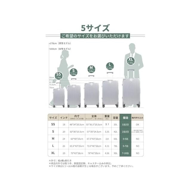【1年間無料】商品到着後(30日内)、誤配送・破損・故障等の問題がございましたら、早急に出品店舗へとご連絡ください。返品、返金、交換などを承ります。 ※サイズ表画像をご確認の上ご注文ください。ご注意:シルバーのスーツケースの一部のロットは、両面仕切りに変更されていますのでご注意ください。両面仕切りとX型クロスベルトの内装はランダムにされます。