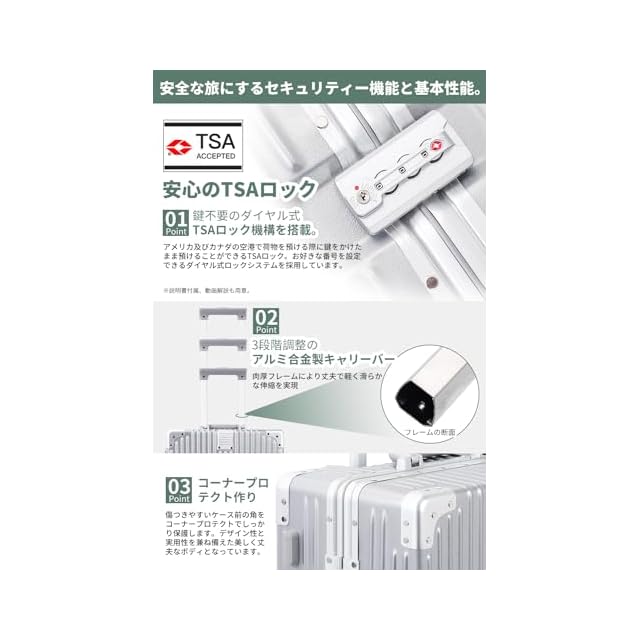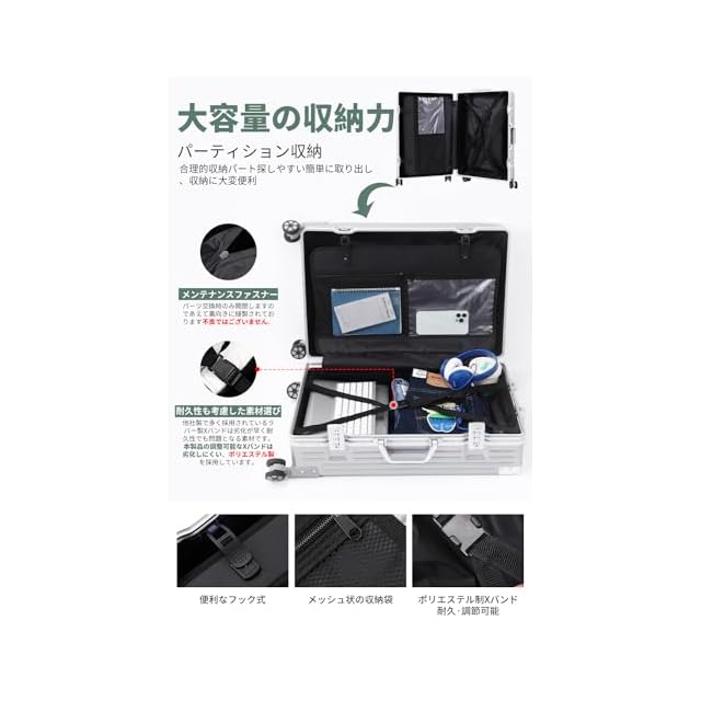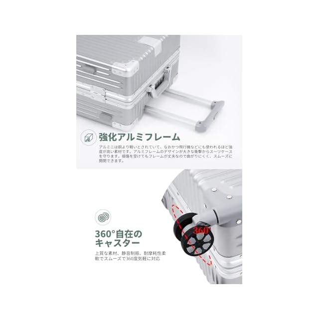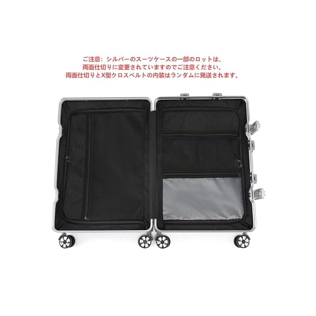 【軽量で、大容量】人気のアルミフレームを採用しており、ビジネスでもカジュアルでもシーンを選ばずに使用できます。本体は耐久性に優れたABS樹脂とPC製で、密閉度の高いアルミフレームにより、ファスナーレスとなっております。【注意】フレームの材質だけがアルミニウムです。スタイリッシュでありながら、5サイズの重量はわずか3~5KG、それでいて容量は35ℓ~90ℓと国内旅行や小旅行には十分な大きさです。ご注意:シルバーのスーツケースの一部のロットは、両面仕切りに変更されていますのでご注意ください。両面仕切りとX型クロスベルトの内装はランダムにされます。