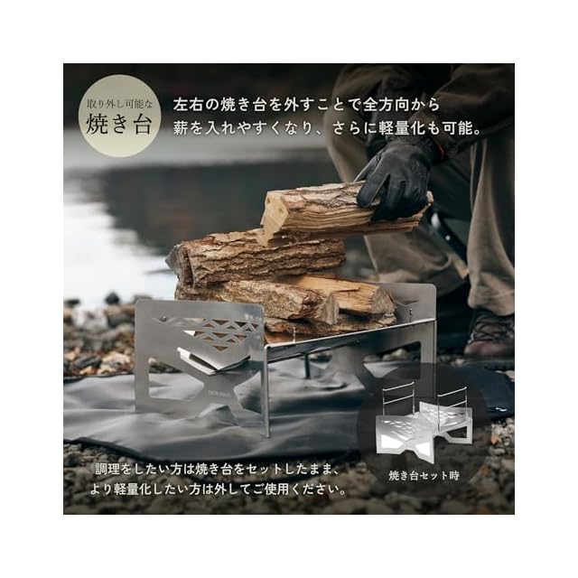 【焼き台のメリットで快適な焚き火】マクライト2の焼き台は、調理の有無や軽量化を考慮して着脱が可能。さらに、五徳の高さを3段階に変更できるため、火力の調整が不要です。これにより、調理時の面倒な火力調整をすることなく、快適に焚き火や調理を楽しめます。