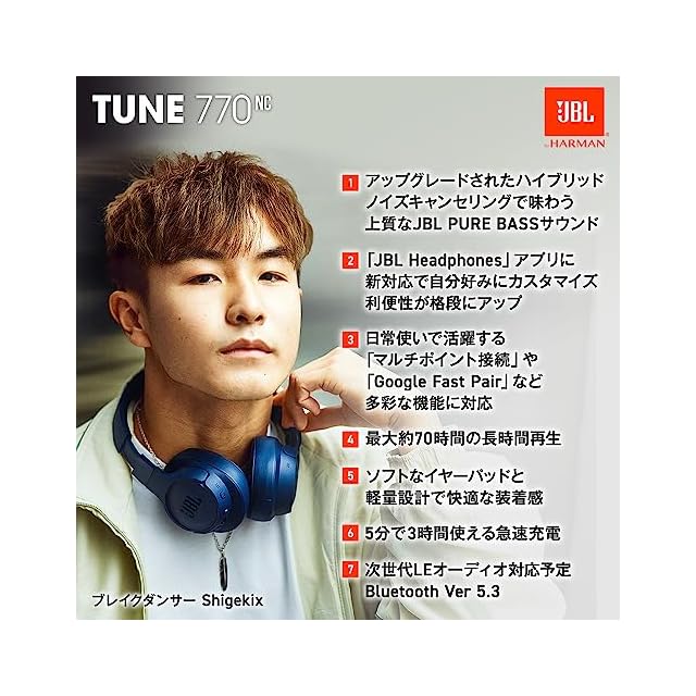 最大約70時間再生可能(ノイキャンオフ時)、また5分の充電で約3時間分再生の急速充電対応。3.5mmオーディオケーブル付属で、ワイヤレスでも有線ヘッドホンとしても使用可能。