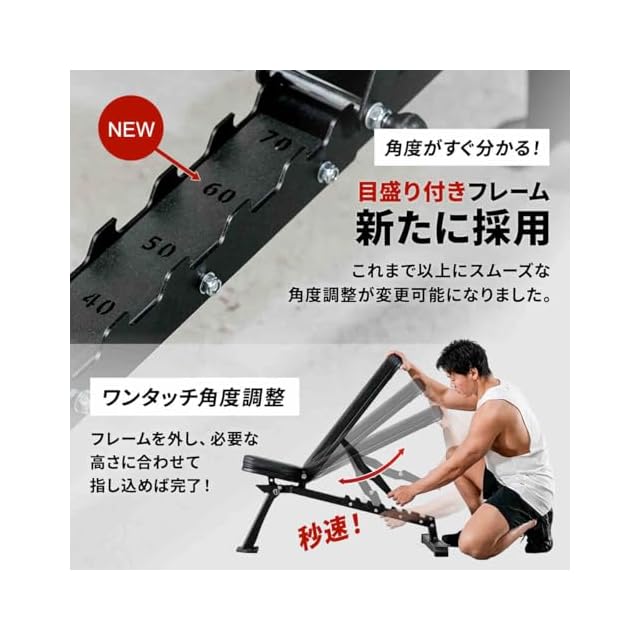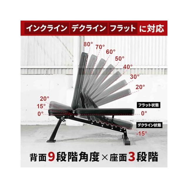 角度設定に迷わない、ダンベルトレーニングに最適なインクライン角度(20-30-40-50-60-70-80度)更にデクラインにも対応。座面角度3段階調整。
