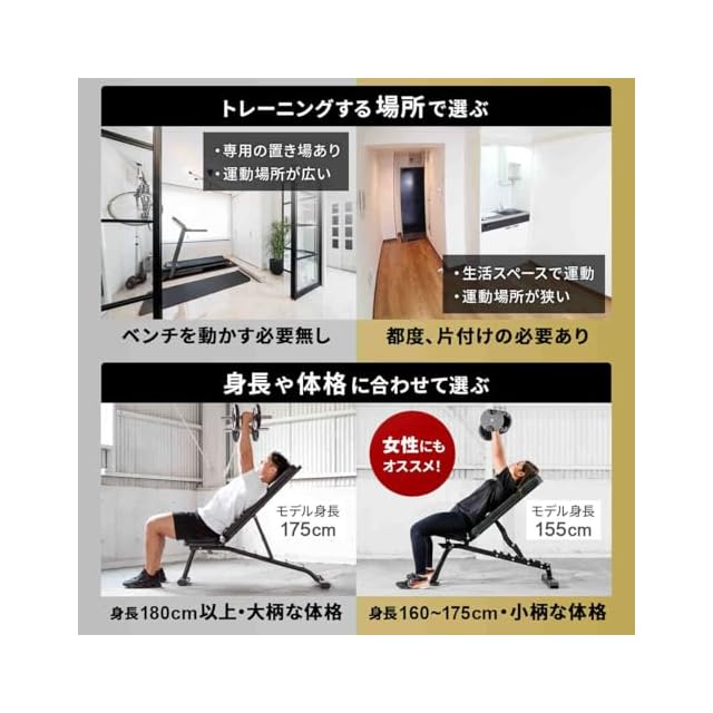よりコンパクトに収まる理想的な収納形状(意匠権申請済)。角度設定に迷わない、ダンベルトレーニングに最適なインクライン角度(20-30-40-50-60-70-80度)更にデクラインにも対応。座面角度3段階調整。