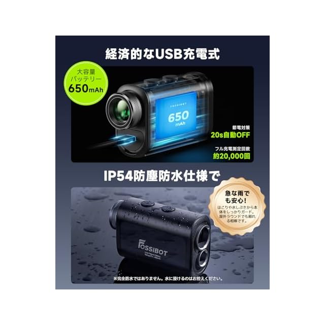 【IP54 防水|大容量 650mAh|測距範囲 3-1000m】FOSSiBOT F1000 ゴルフスコープの測定範囲 3~1000 メートル(1093 ヤード)、905nm レーザー波長を採用、穿透性に優れ大気散乱を抑え、データ信頼性が高く、多場面の測距ニーズに応えます。650mAh バッテリー搭載、満充電で約 20,000 回測定可能。20 秒無操作で自動 OFF の省電力機能で長時間持続、頻繁な充電不要。Type-C インターフェース採用、約 2 時間で満充電、充電簡便かつ効率的。IP54 防塵・防水を備え、霧モードとの組み合わせで雨天・霧の日など過酷な天候でも正確測定可能、全天候安定使用をします。