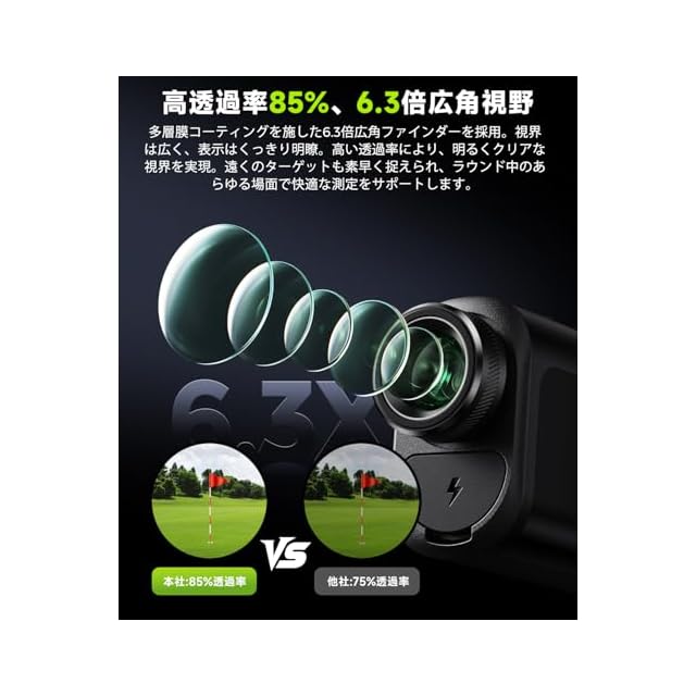 【LCD 黒表示|0.02s 測定|6.3 倍広角視野|高透過率85%】FOSSiBOT F1000 ゴルフ 距離計は、85% 高透過率の LCD ビューファインダーを搭載し、強い光の下でもデータを鮮明に表示し、素早く正確な距離を把握できます。多層膜コーティングの光学レンズと 6.3 倍の拡大倍率を採用し、広い視野とリアルな色彩再現を実現し、遠くの目標を簡単にロックできます。独自の測距技術を活用し、最速 0.02 秒での応答を実現しており、手ブレ補正機能がなくても安定した測定が可能です。さらに視力補正ピント調整リングを搭載し、さまざまなユーザーの視力に適応し、遠距離の目標に正確にピントを合わせることをします。