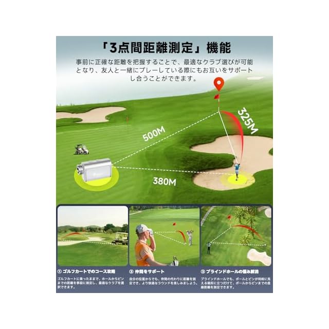 【最新機能3点測距モード】FOSSiBOT F1000 ゴルフ距離測定器の三点間測距機能は、ゴルフシーンに特化し、多様な測距ニーズに柔軟に対応。ゴルフカートに乗ったままホール - ピン間距離を事前測定して的確にクラブ選択したり、自分の位置から仲間の代わりに測距して複数人プレイをよりスムーズにしたりも可能。さらにプラインドホール(視界遮断ホール)では、ボールとピンが同時に見える場所に立ち、「ピン狙い→ボール狙い→電源ボタン短押し」の簡単 3 ステップで、ボール - ピン間直線距離を自動算出・表示。この機能で複雑なシーンの測距難題を解消し、ゴルフのスイングをより効率的かつ楽にします。