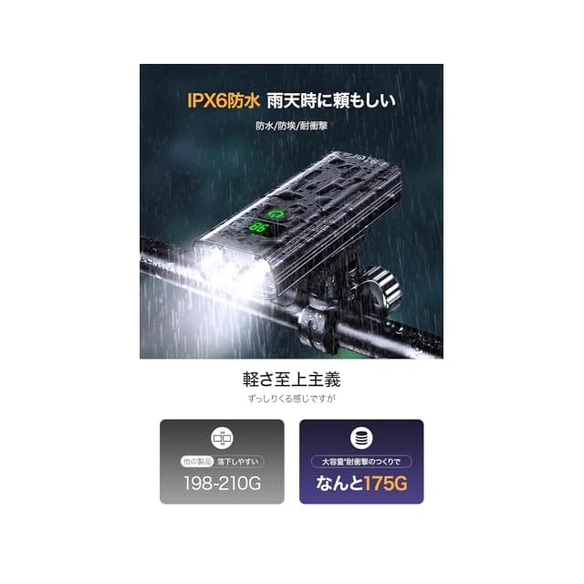 ☀【簡単取付・高强度ボディ・IPX6防水】自転車の種類を問わずどんな太さのハンドルにもしっかりマッチして確実に固定可能、工具不要、フロントライトもテールライトも簡単に脱着可能。段差の振動に耐えられ、悪い道路の衝撃でも容易に脱落しません。アルミ合金製ヘッドライトで、衝撃に強い頑丈なつくりになっていて、日常使用に不意な落下や衝撃にも壊れにくい。雨天時に頼もしいIPX6防水規格、突然の雨でも慌てなく走行でき、悪天候にも使える自転車ライトです。