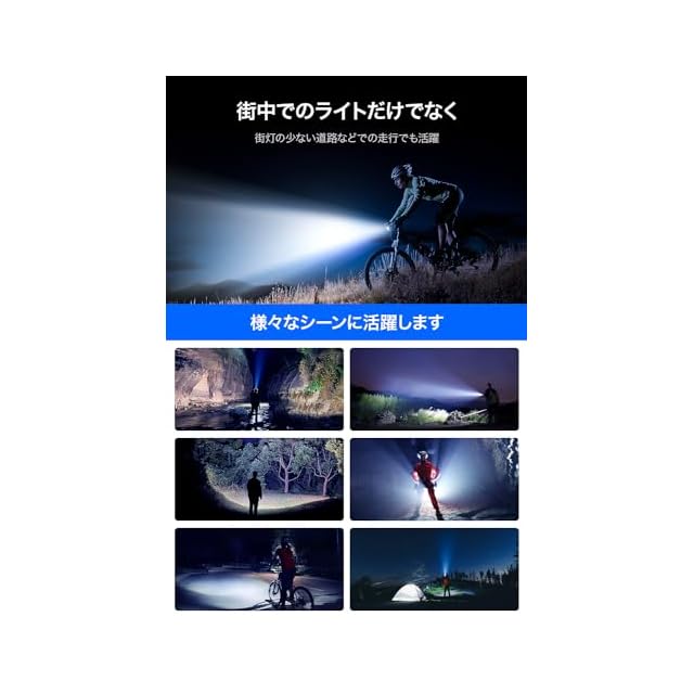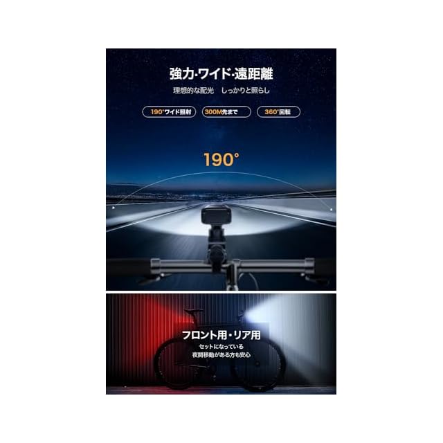 ☀【高輝度・ワイド・遠距離照射】パワフルな4個ランプ搭載し、最大1000ルーメン・約300メートル(ハイビーム)先までしっかりと照らしてくれます。190°ワイド照射により通常に比べ、もっと広範囲に照らし、前方の路面はもちろん、対向車や両側の歩行者の状況も確認しやすい。テールライト付属、後の車にも存在をアピールでき、街灯が少ない夜道でも心強いので、朝夜の自転車通勤や通学にぴったりな自転車用ライトです。