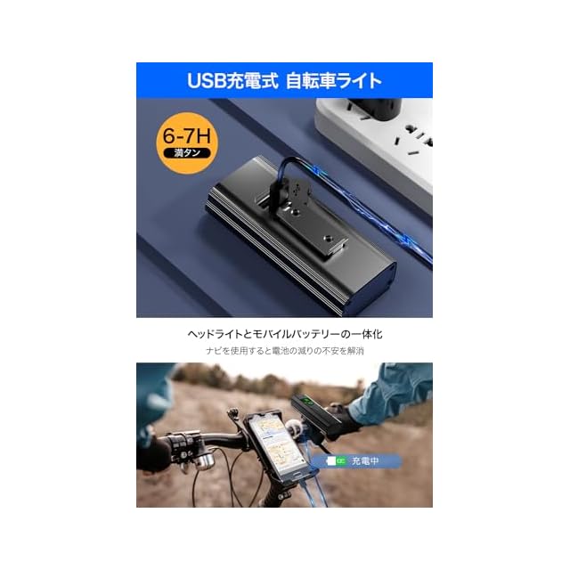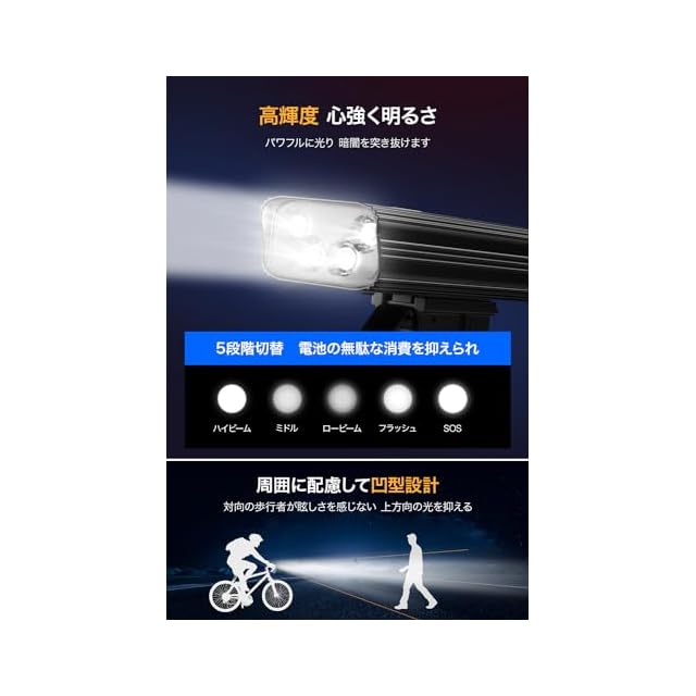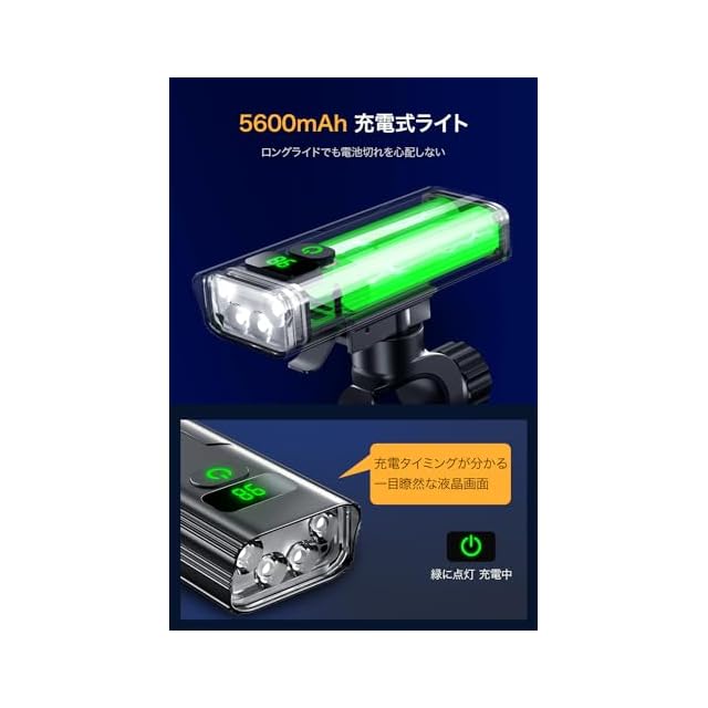 ☀【大容量・USB充電式自転車ライト】圧倒的な5600mAh大容量を内蔵したUSB充電式の自転車用ライト、モバイルバッテリーやUSB充電器に繋ぐと繰り返し充電可能、電池交換は不要。ロングライドでも電池切れを気にせず楽しめます。ハイ・ミドル・ロー・フラッシュ・SOSの5つモードを備え、道路状況やシーンに合わせて調節可能。夜道で事故から身を守ってくれるので、自転車での通勤通学、サイクリング、アウトドアなど様々なシーンで活躍してくれます。