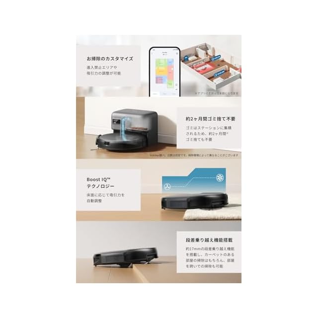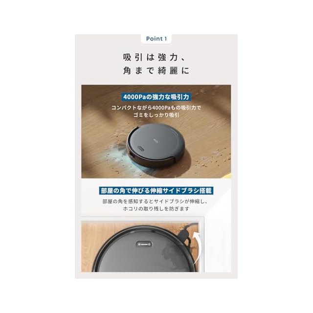 吸引は強力、角まで綺麗に:最大4000Paの強力な吸引力と部屋の角を感知すると伸縮するサイドブラシで、今まで届きにくかった角のゴミやホコリもしっかりかき出し、吸い残しを防ぎます。