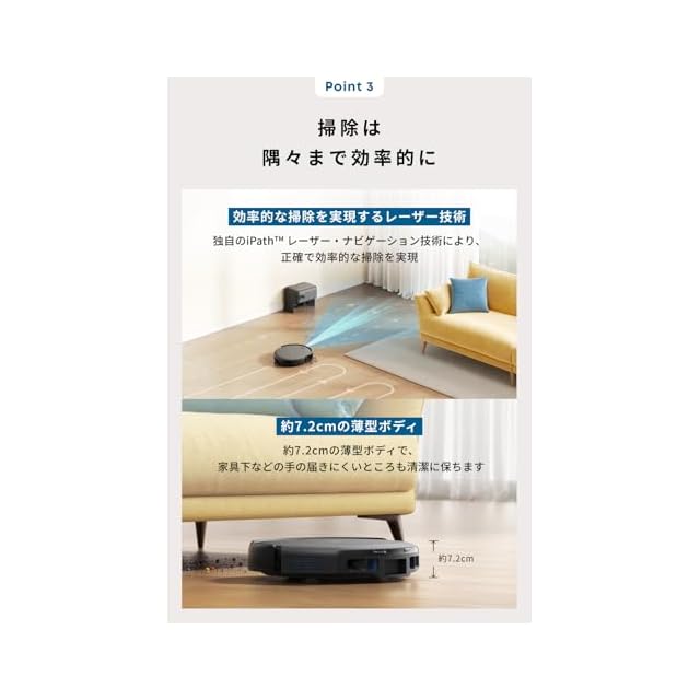 掃除は隅々まで効率的に:約7.2cmの薄型のボディで狭い空間にも入り込み、手の届きにくいところも隈なく清掃します。またiPathレーザーナビゲーション技術により掃除に最適なルートを作成し、効率的に掃除します。