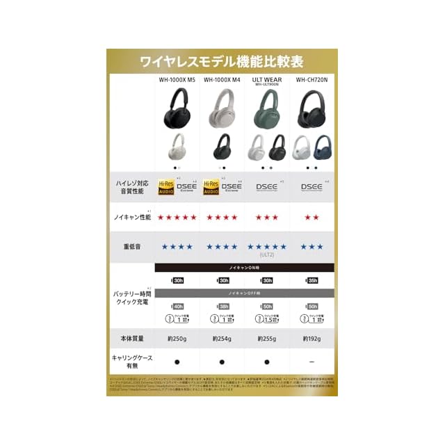 2台の機器と同時接続し、それぞれで通話も音楽も受信できるマルチポイント機能に対応。ノイズキャンセリングON時で最長35時間(*)、OFF時で最長50時間(*)音楽再生可能なロングバッテリーライフ、さらには3分充電で約1時間再生可能なクイック充電(*)にも対応しています。 * コーデックはAAC。DSEE/イコライザーの搭載モデルはOFF設定時、またその他機能は全て初期設定時