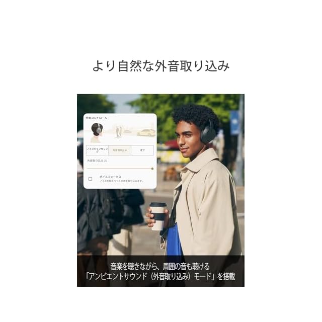 音楽を聴きながら、周囲の音も聴ける「アンビエントサウンド(外音取り込み)モード」を搭載。信号処理における外音取り込み量を増やすことで、より自然な外音取り込みを実現します。さらに「ボイスフォーカス」をONにすることで、ノイズを抑えつつ人の声を取り込むことも可能です(*)。*「Headphones Connect」アプリからON/OFFの切り替えが可能です