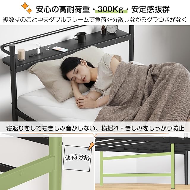 [異音なし・耐荷重300kg] 高い安定性と耐久性のため、こちらのベッドフレームは12本のパイプワイヤー (中骨)を設けたうえ、最も負荷にかかる中央連結部分にも太めのダブルパイプと中央脚のデザイン、6本脚でベッドフレームの全体の安定性がアップ。ベッド総体耐荷重は余裕の300Kgになります。スプリングマットレスを敷いて、寝転がってグラつきや軋みなどは発生しません。とても頑丈で長く使えるベッドフレームです。宮棚までは約25.5cmなので、厚めのマットレスにも対応可能、安定感のある寝心地をサポートします。