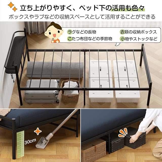 [床下収納30cm・優れる通気性]ベッド下の高さは最大30cmになるため、収納スペースとしてもたっぷりと有効活用していただけます。衣装ケースなど大きなケースや収納に困る長物類まですっぽり収納できます。このくらいの高さは掃除機の清掃もラクです。床板には空気を通すパイプワイヤー×12本を使用されますので、木製のベッドより通気製がよく、カビやダニの発生原因を根本からクリアーします。常に寝床を清潔に保ってくれます