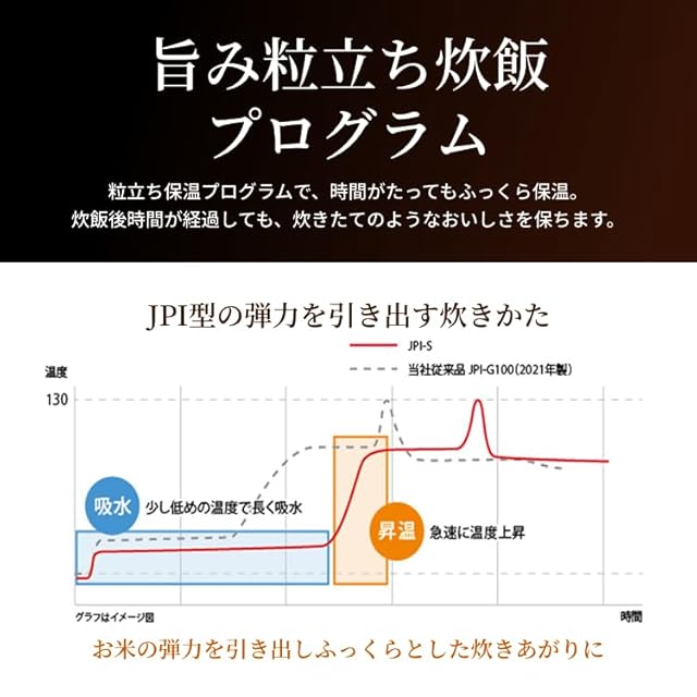 【旨み粒立ち炊飯プログラム】土鍋ごはんの炊き方をお手本に、少し低めの温度で吸水した後、急速に温度を上昇させることで、お米の弾力を引き出し、味わい深いごはんを炊きあげます。
