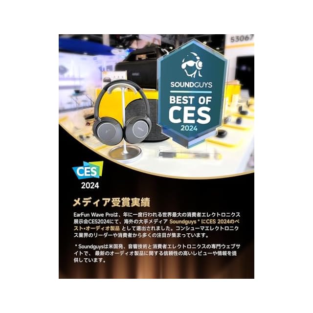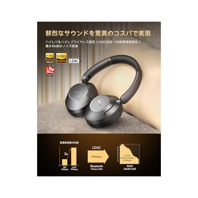 【EarFunがさらに進化!ヘッドフォンへの新たな挑戦】高音質コーデックLDACに対応し、 CDの情報量(24bit/96kHz)の約3倍という圧倒的な情報量を最大990kbpsのビットレートで伝送します。 日本オーディオ協会 (JAS)からハイレゾオーディオ&ハイレゾワイヤレス認証も取得しました。 オリジナル音源の雰囲気を損なうことなく、一つ一つの音の粒立ちや立体感を再現します。【40mm大口径ドライバー搭載】EarFun Wave Proは、ダイヤモンドと黒鉛の中間的な特性を硬質炭素膜「Diamond-Like Carbon(DLC)」をコーティングした大口径φ40mm振動板を採用しており、リズミカルな低音、温かみのある中音、クリアな高音を提供します。最大40kHzという広い帯域をカバーし、繊細でクリアなオーディオ体験を実現します。