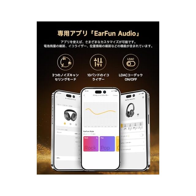 【連続再生80時間】大容量800mAh内蔵バッテリーにより、ANCオフモードでフル充電した場合、最大80時間の連続再生が可能です。ANCを常時オンにしても 55時間再生が可能で、充電はわずか2時間で完了します。【専用アプリ「EarFun Audio」&シアターモード】強制登録不要、マルチバンドイコライザー、バッテリー表示、カスタマイズ可能なタッチコントロールなど豊富な機能をご利用いただけます。改良を重ね、より使 いやすく進化しました。2025年新アップグレード版によりシアターモードをサポート。EarFun Audioアプリでシアターモードを有効にすると、映画館のような立体音響体験をお楽しみいただけます。