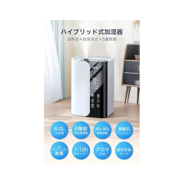 加湿器 大容量 6L 【2025年新モデル・5重除菌・加熱式】 超音波式 加湿器 卓上 ハイブリッド式 アロマ対応 上から注水 マイナスイオン 空気清浄機能 100℃高温除菌 UVライト 6段階加湿量 吹出口360°調整 湿度調整/温度表示/チャイルドロック/12Hタイマー 水漏れ防止 空焚き防止 遠隔制御 リモコン付き オフィス/事務所/家庭用 | つむぎ屋