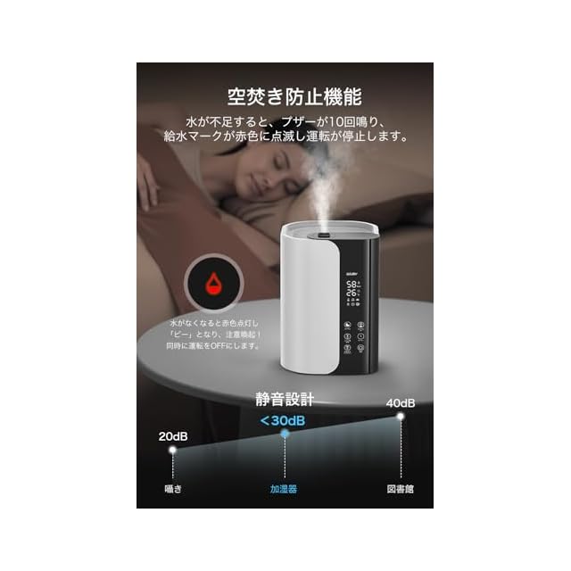 【湿度センサー搭載✜温湿度表示】本体に湿度センサーを内蔵。現在の温度と湿度をLEDディスプレイに表示し、視覚的にわかりやすく確認できます。湿度は40〜90%の範囲で調整可能。設定値に達すると自動停止し、過加湿を防いでバランスの取れた環境を保ちます。子供が触れてしまうことを防ぐためのチャイルドロック機能があります。チャイルドロックを長押しすると、操作パネルやリモコンから加湿器を操作することができなくなります。