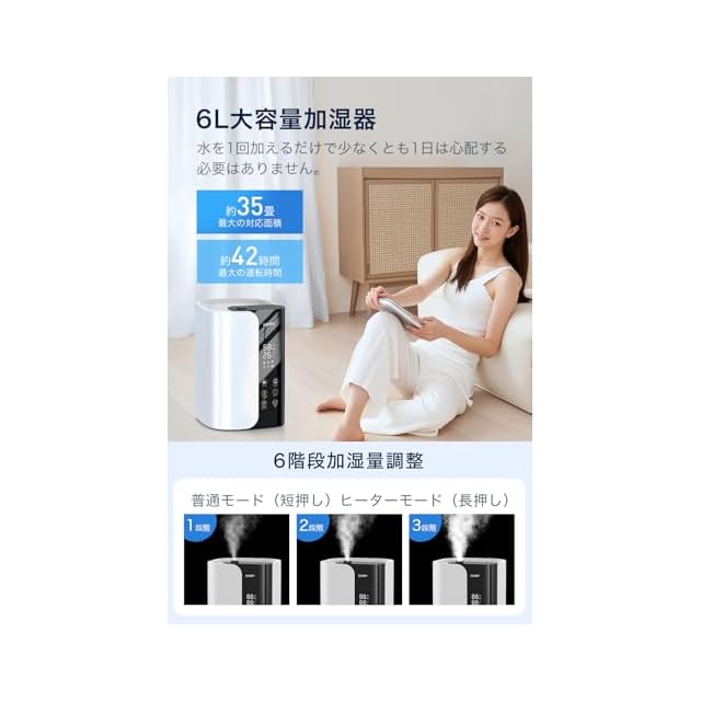 【6段階加湿量 ✜ 1〜12Hタイマー ✜ 静音設計】常温・加熱それぞれ3段階、合計6段階の加湿量を調整可能。1〜12時間(1時間ごとに調整)切タイマー付きで、外出時や就寝時も安心です。静音設計により、運転音はほとんど気にならず、オフィス作業やリラックスタイムにも最適です。