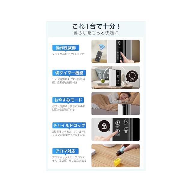 【アロマ対応 ✜ 簡単給水 ✜ お手入れラクラク】アロマ対応の専用コンテナを内蔵し、ミストとともに香りも楽しめます。水槽には隠しハンドルを採用し、給水や移動も簡単。さらにお手入れもしやすく、日常的に快適にご使用いただけます。日本電気用品安全法(PSE)適合性検査認証済です。PSEマークが付いていますので、ご安心にお使いいただけます。セット内容:麦飯石除菌フィルター(本体にセット済)、リモコン、日本語取扱説明書。