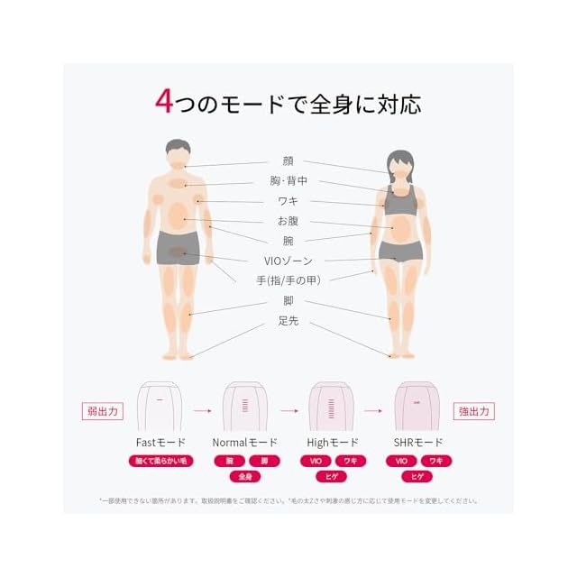【✨VIOにも安心な痛みレス*⁶ケア】サロンにならったSHRモード搭載でVIO、ヒゲや脇など、強い光を当てるのが心配な部位の太い毛もしっかりケア。UlikeのSHRモードは、ダブルランプが高速なパルスで時間差照射し、一回のプッシュで4回連続フラッシュします。エネルギーを蓄積しながら照射するのでよりハイパワーなケアが可能。肌への負担が少ないため、繊細な部位にも安心して使用できます。