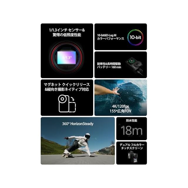 ✅[10-bit & D-Log M カラーパフォーマンス] - ディテールまでクリアに捉え、スムーズな後編集を実現します。このアクションカメラで4K映像を撮影しても、カラーグレーディングや後編集が簡単に行えます。